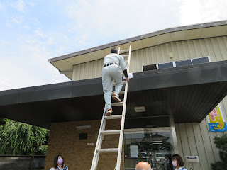 また、今回は本社にて災害時の避難訓練も行いました。火災時等正面玄関から脱出できない場合を想定して避難用梯子の使用訓練を実施しました。