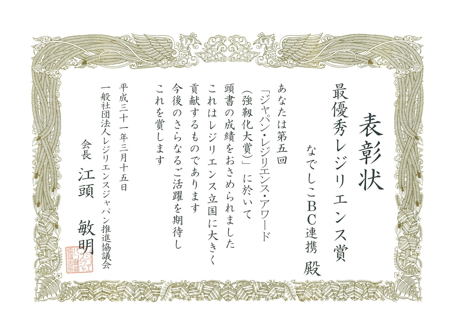 なでしこBC連携「ジャパン・レジリエンス・アワード2019」最優秀レジリエンス賞受賞